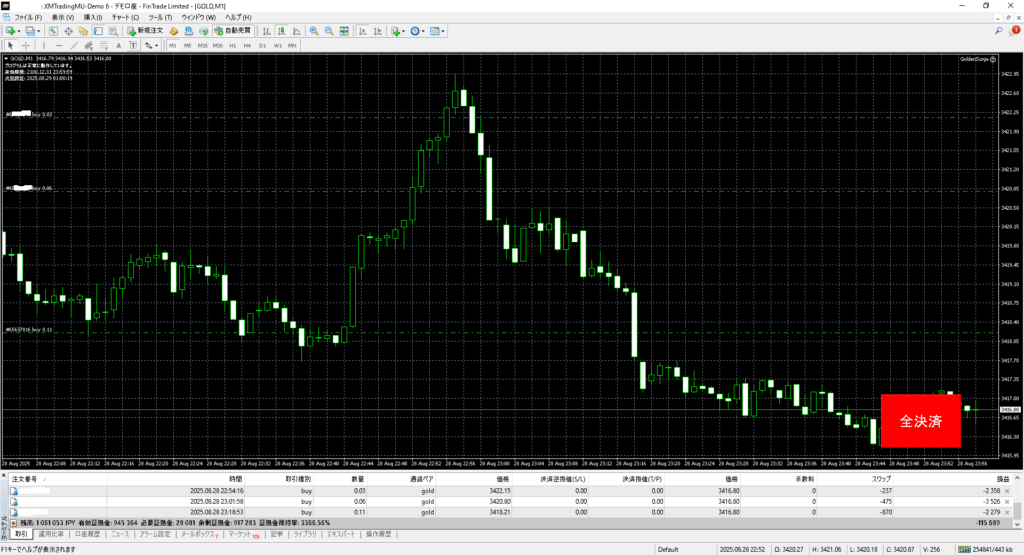 GoldenSurgeトレード結果:2025年8月28日(木)デモトレード