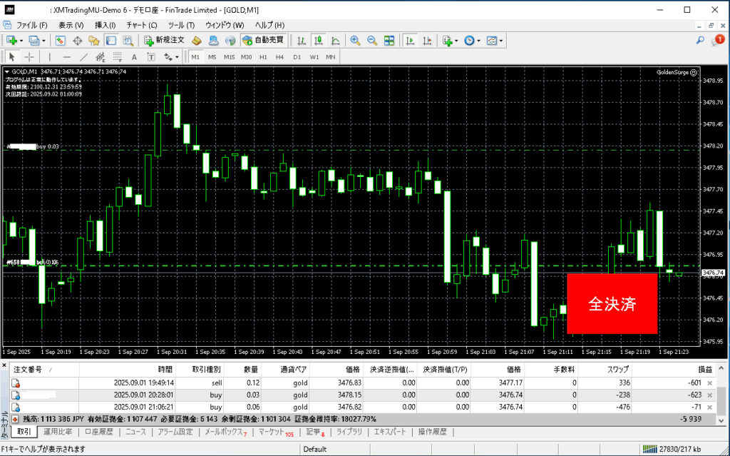 GoldenSurgeトレード結果:2025年9月1日(月)デモトレード